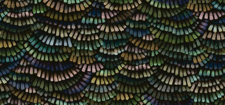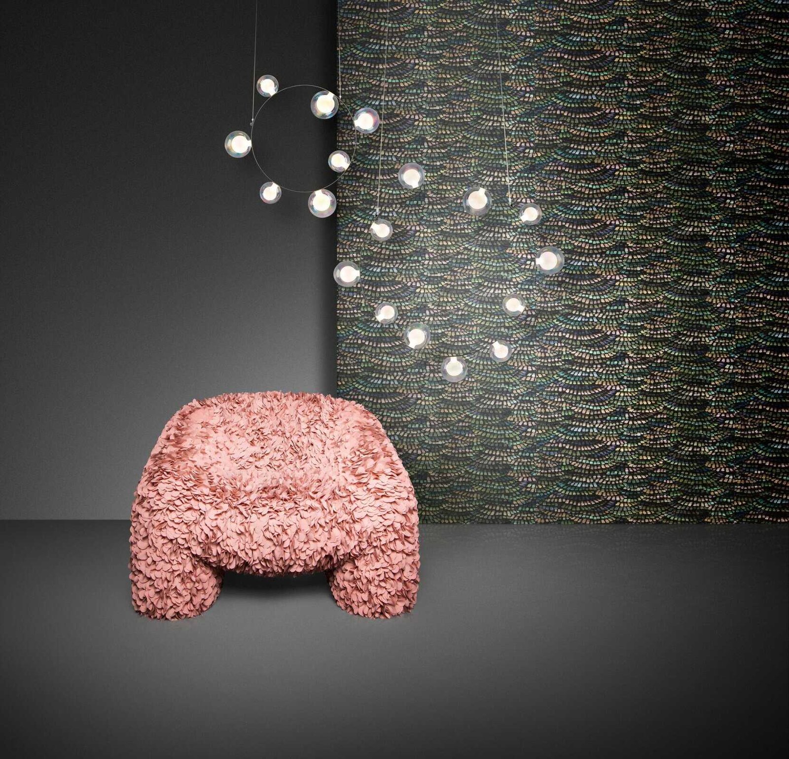Deze muurbekleding uit geplooid textiel is geïnspireerd op de unieke kleur en waaiervormige vleugels van de Dandelion Crane. Het tactiele dessin is het resultaat van overlappend textiel in een patroon dat doet denken aan gevederde waaiers.