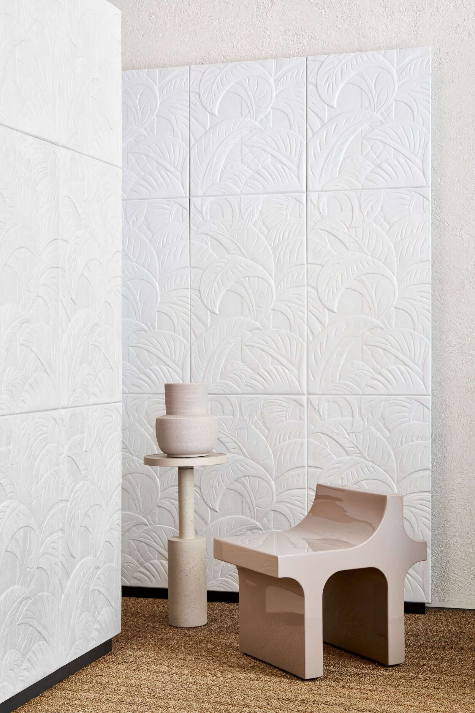 Deze tekening in tegelvorm verkrijgt veel reliëf door de gebruikte techniek en het volumineuze materiaal. Het bladeren patroon is geïnspireerd op dadelpalmen, Medjoul; een veelvoorkomende plant in het Midden-Oosten.