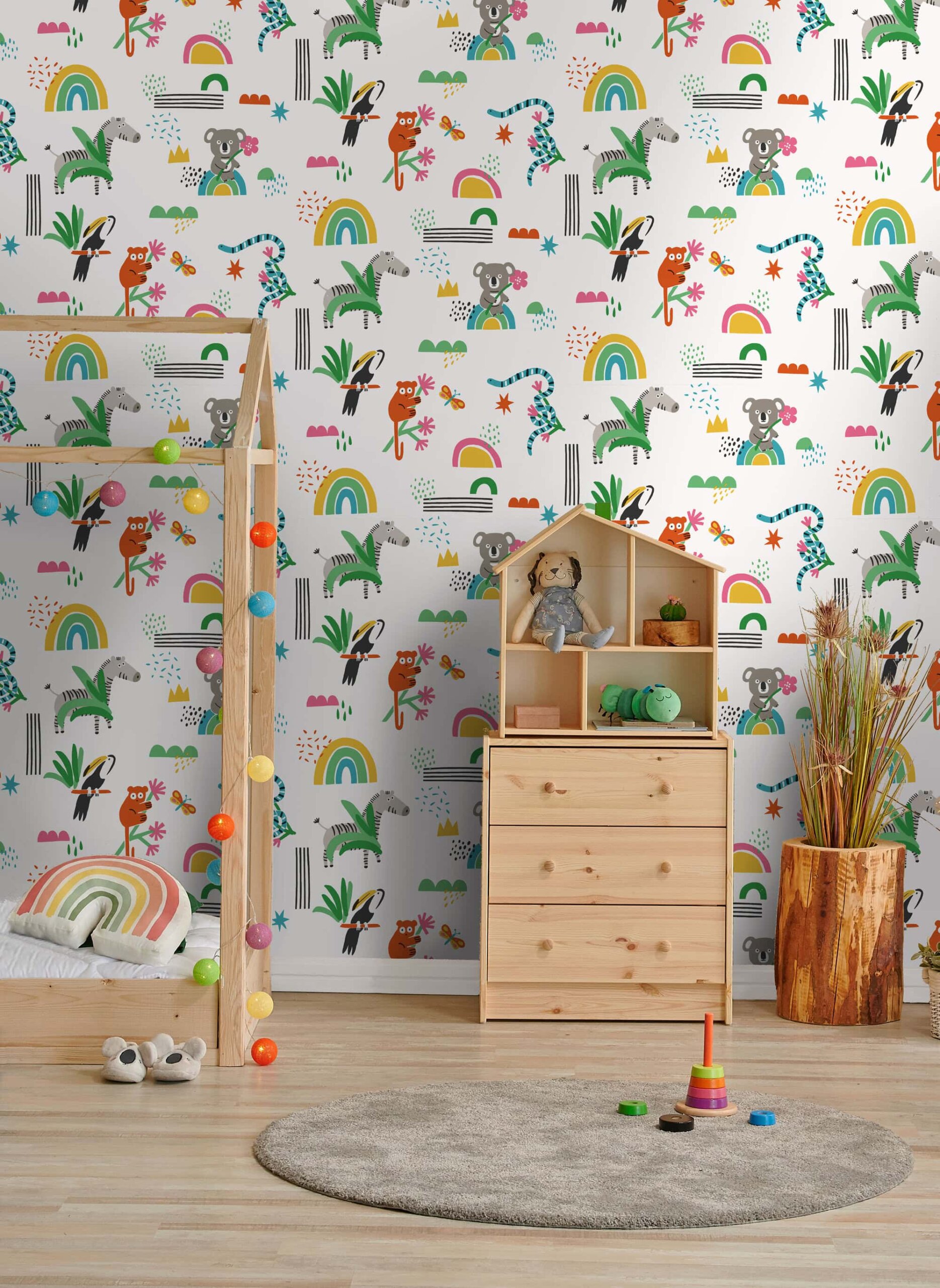 Voor de jongsten is dit behang ideaal als dierenbehang, of in combinatie met ruitjes en strepen. De kleuren zijn zacht, de vormen vriendelijk, maar altijd met een creatieve knipoog.